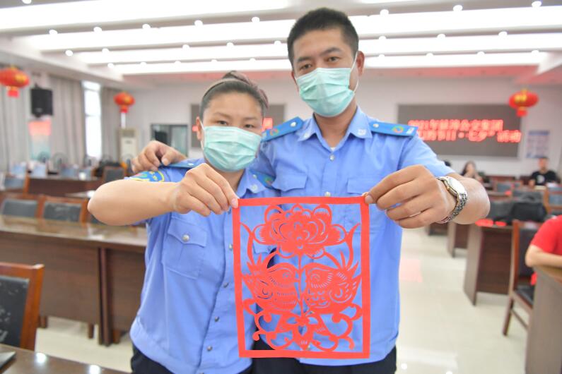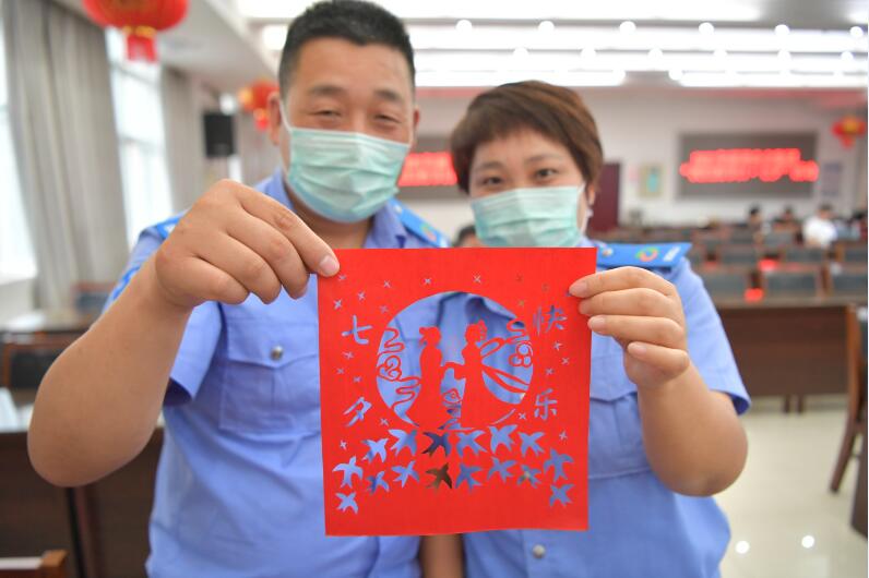 隨后,非物質文化遺產蚌埠區級剪紙傳承人吳桂蘭登場,介紹剪紙藝術文化,并現場教授剪紙技藝,大家興趣濃厚,認真學習,積極向吳老師討教,個個學得興致盎然,不一會兒,一幅幅愛情主題的作品躍然于剪刀下。大家爭先恐后地展示著自己的作品,現場歡聲笑語不斷。吳桂蘭表示,兩天前接到活動邀請,便著手準備,抽出時間剪了很多關于七夕和公交主題的作品,送給公交車夫婦們,向他們表達敬意和節日的祝福。