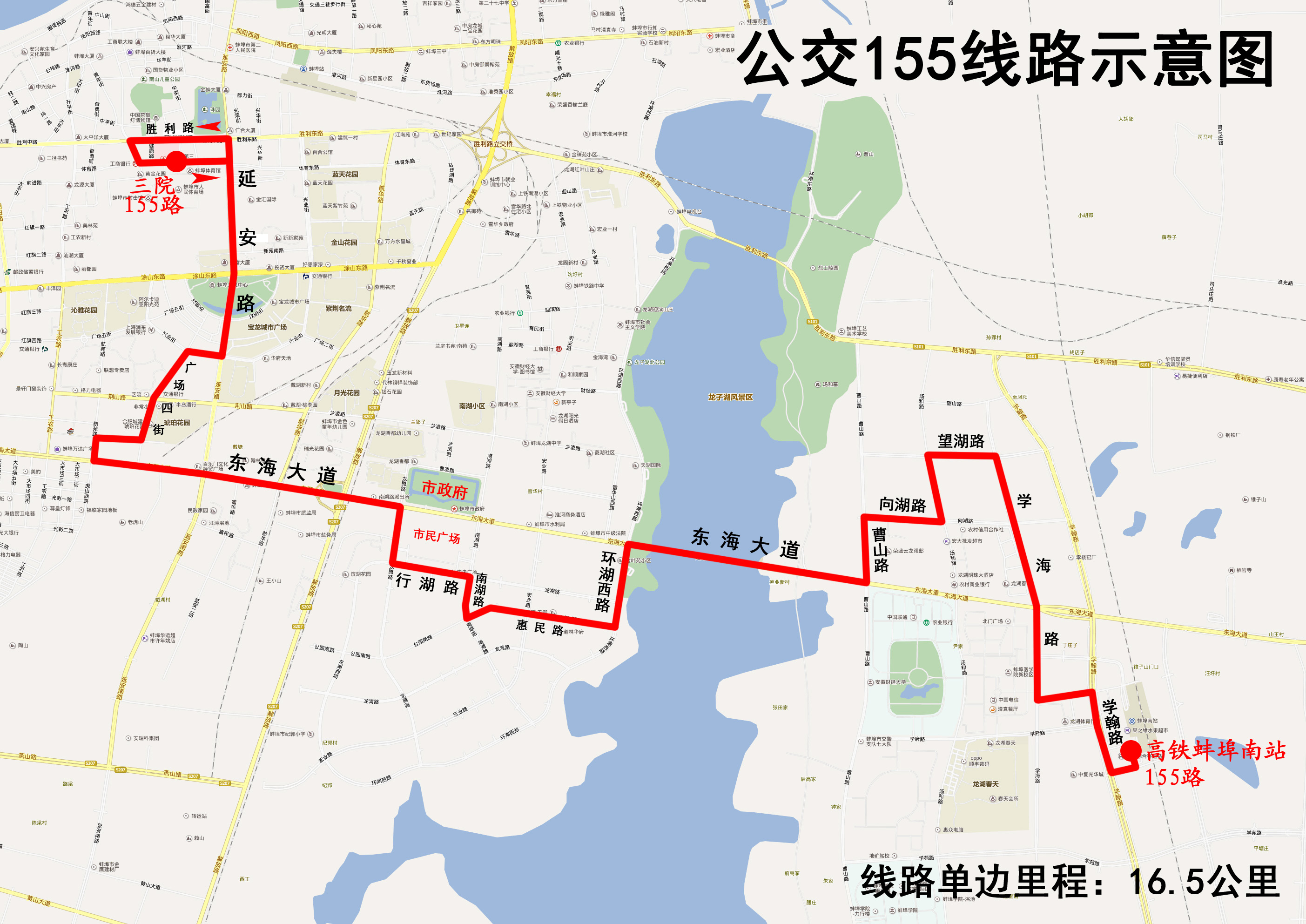 線(xiàn)路走向:三院—體育路(勝利路)—延安路—興業(yè)街—廣場(chǎng)四街—匯達(dá)路—航苑路—東海大道—龍騰路—行湖路—南湖路—惠民路—環(huán)湖西路—東海大道—曹山路—向湖路—湯和路—望湖路—學(xué)海路—海亮明珠—學(xué)翰路—高鐵蚌埠南站。