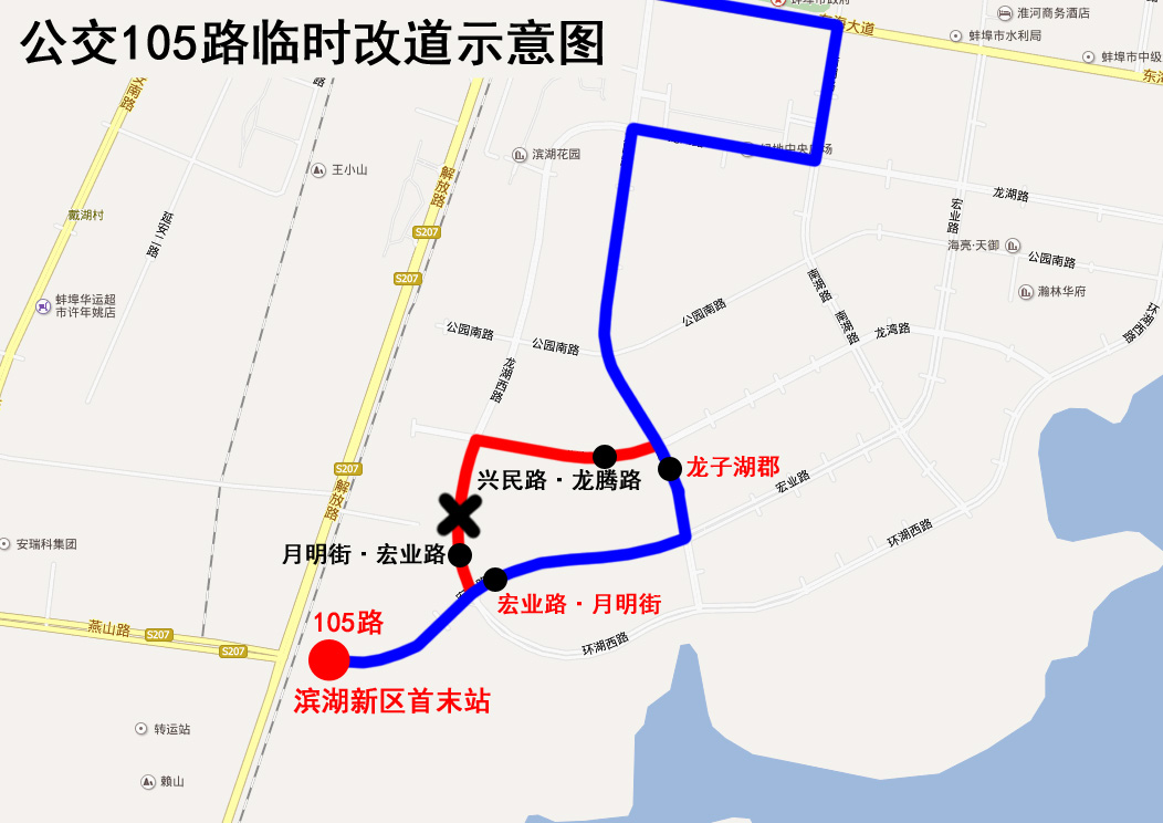 105路公交車臨時改道公告 因月明街(興民路至宏業路)封閉施工,2019年4月17日起,公交105路來回雙向改道為:原線路—龍騰路—宏業路—濱湖新區首末站。 改道期間公交車將取消停靠“興民路•龍騰路”、“月明街•宏業路”站。臨時停靠“宏業路•月明街”、“龍子湖郡”站,封閉施工結束后恢復原線。