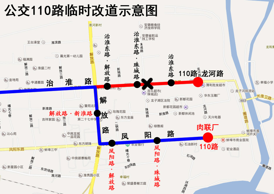 110路公交車臨時改道公告 因治淮路(解放路至東圈堤)封閉施工,2019年4月23日起,公交110路來回雙向改道為:原線路—治淮路—解放路—鳳陽路—肉聯廠首末站。 改道期間公交車將取消停靠“治淮東路•解放路”、“治淮東路•珠城路”、“治淮東路”、“龍河路”站。臨時停靠“解放路•新淮路”、“鳳陽路•解放路”、“鳳陽路•珠城路”、“肉聯廠”站。封閉施工結束后恢復原線。