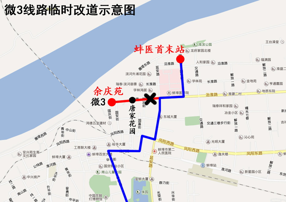微3路公交車臨時改道公告 因治淮路西段(國治街至延安路)封閉施工,2019年7月20日起,公交微3線路來回雙向改道為:客運南站—原線路—延安路—治淮路—國強路—蚌醫首末站。 改道期間公交車將取消停靠“唐家花園”、“余慶苑”站;臨時停靠“蚌醫首末站”站。封閉施工結束后恢復原線。
