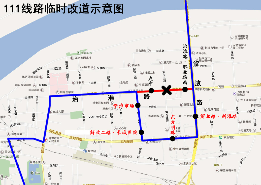 因治淮路(解放三路至解放路)封閉施工,2019年7月20日起,公交111路來回雙向改道為:機電技師學院—原線路—治淮路—解放二路—鳳陽路—解放路—原線路—客運北站。
