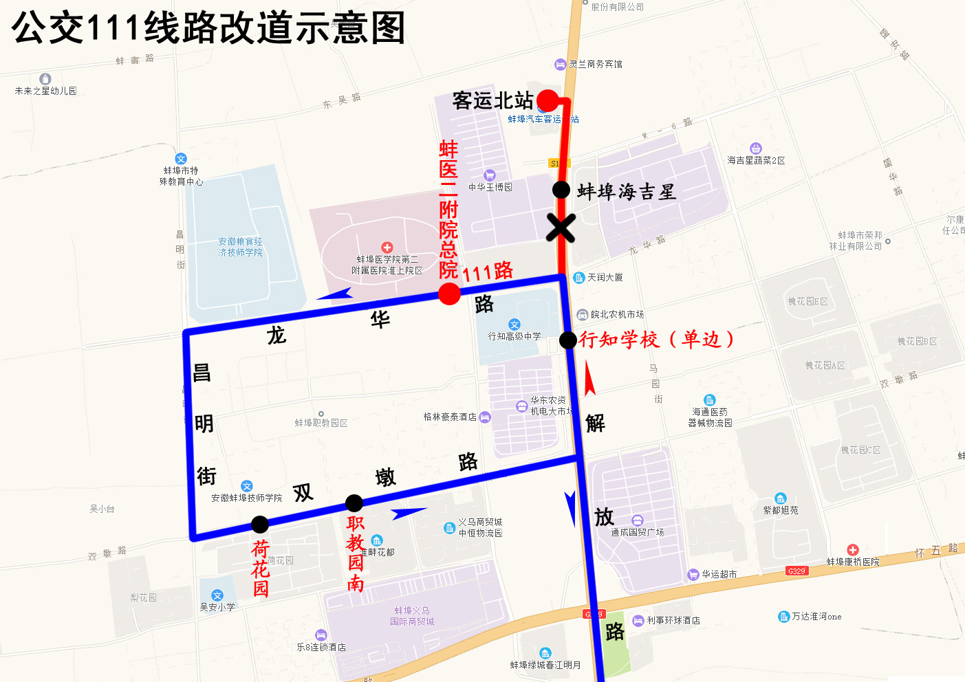 為方便市民去蚌醫(yī)二附院總院就醫(yī)及醫(yī)護人員公交出行,自2020年4月16日起,調(diào)整公交111路部分走向。機電技師學院至客運北站方向調(diào)整為“機電技術(shù)學院—原線路—解放路—蚌醫(yī)二附院總院”;客運北站至機電技師學院方向調(diào)整為“蚌醫(yī)二附院總院—龍華路—昌明街—雙墩路—解放路—原線路—機電技師學院”。 改道后,111路公交車將取消“蚌埠海吉星”、“行知學校(路西站)”??空?;雙墩路上增設(shè)“荷花園”、“職教園南”停靠站。