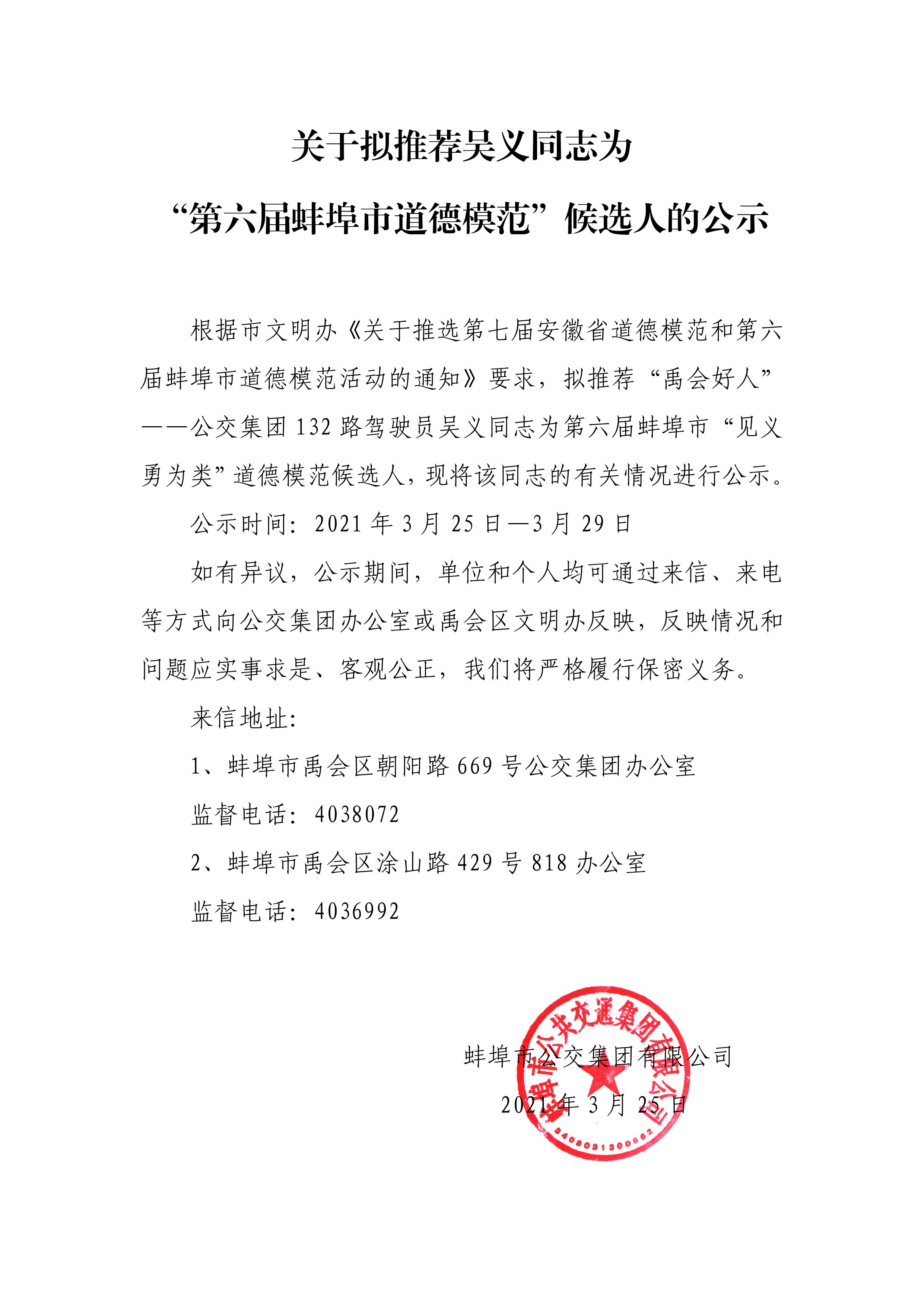 關(guān)于擬推薦吳義同志為“第六屆蚌埠市道德模范”候選人的公示