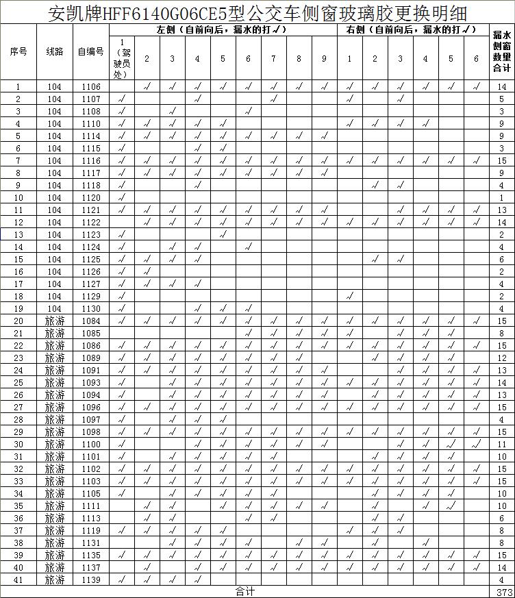 (三)項目內容:安凱牌HFF6140G06CE5及HFF6180G02CE5型84臺公交車共575個側窗玻璃膠更換服務。(具體車輛編號及需更換的側窗玻璃膠明細見附表1);
